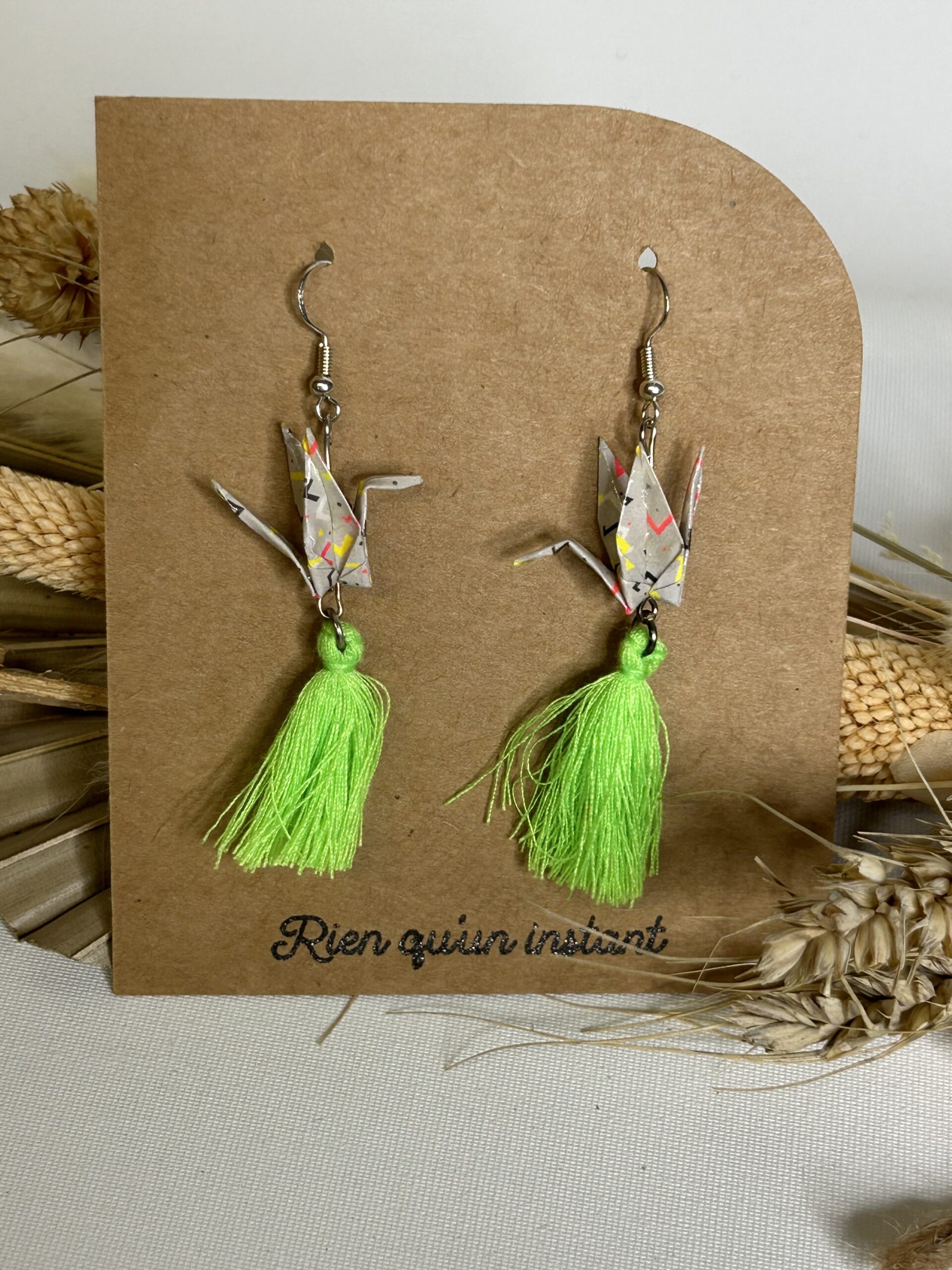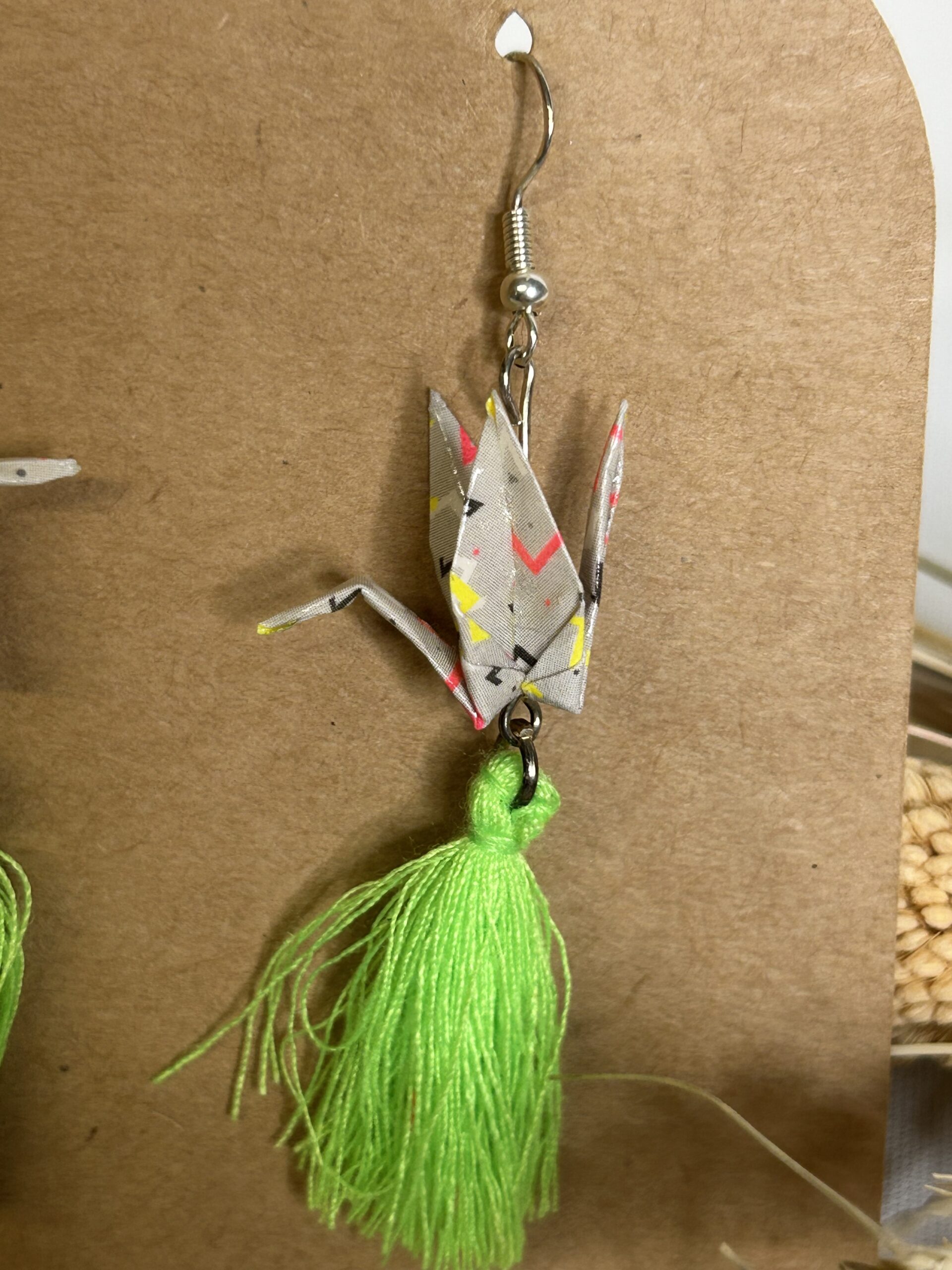 La grue en origami évoque la paix, la chance et la longévité. Ainsi, ce bijou ne se limite pas à un simple accessoire décoratif. Il transmet une intention et une émotion, ce qui le rend idéal pour celles qui aiment porter des pièces porteuses de sens. De plus, le mouvement naturel du pompon apporte de la fluidité et attire subtilement le regard.