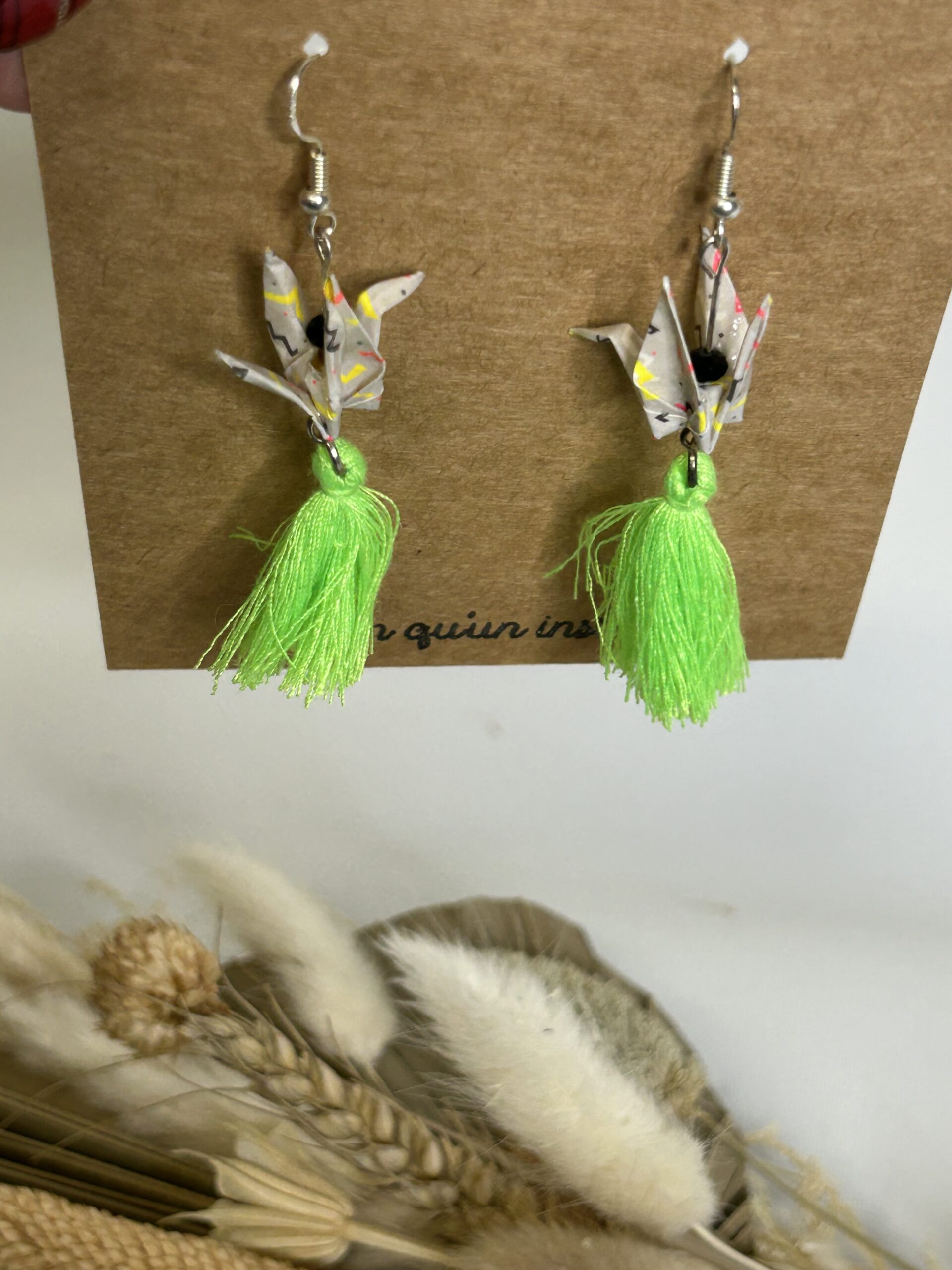 Ces boucles d’oreilles artisanales en origami apportent une touche d’originalité et de sens à votre tenue. Chaque paire associe une grue en papier plié à un pompon textile, créant ainsi un bijou à la fois léger et expressif. Grâce à leur conception minutieuse, elles offrent un bel équilibre entre finesse et caractère.