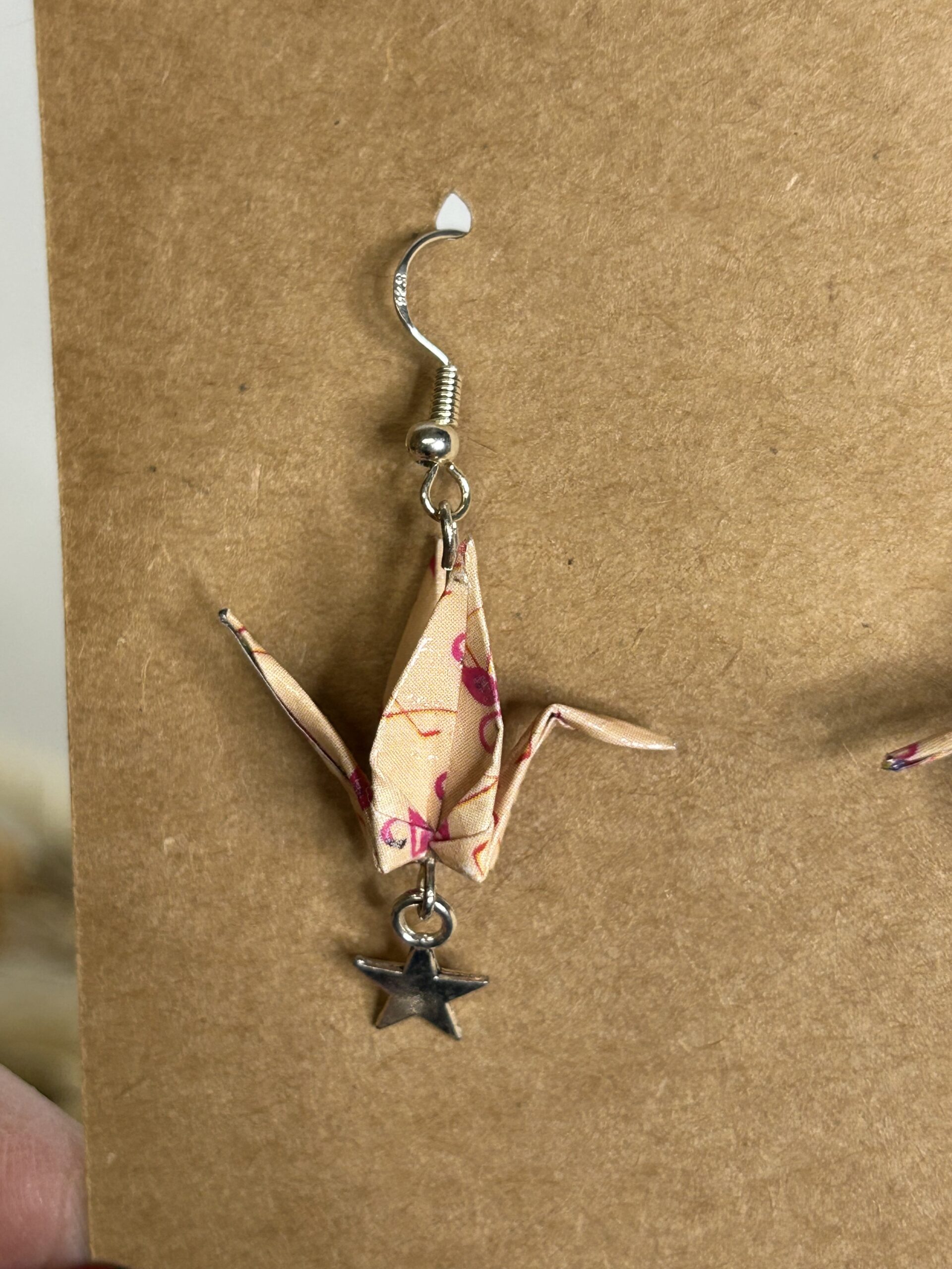 Ces boucles d’oreilles artisanales en origami apportent une touche d’originalité et de sens à votre tenue. Chaque paire associe une grue en papier plié à un pompon textile, créant ainsi un bijou à la fois léger et expressif. Grâce à leur conception minutieuse, elles offrent un bel équilibre entre finesse et caractère.
