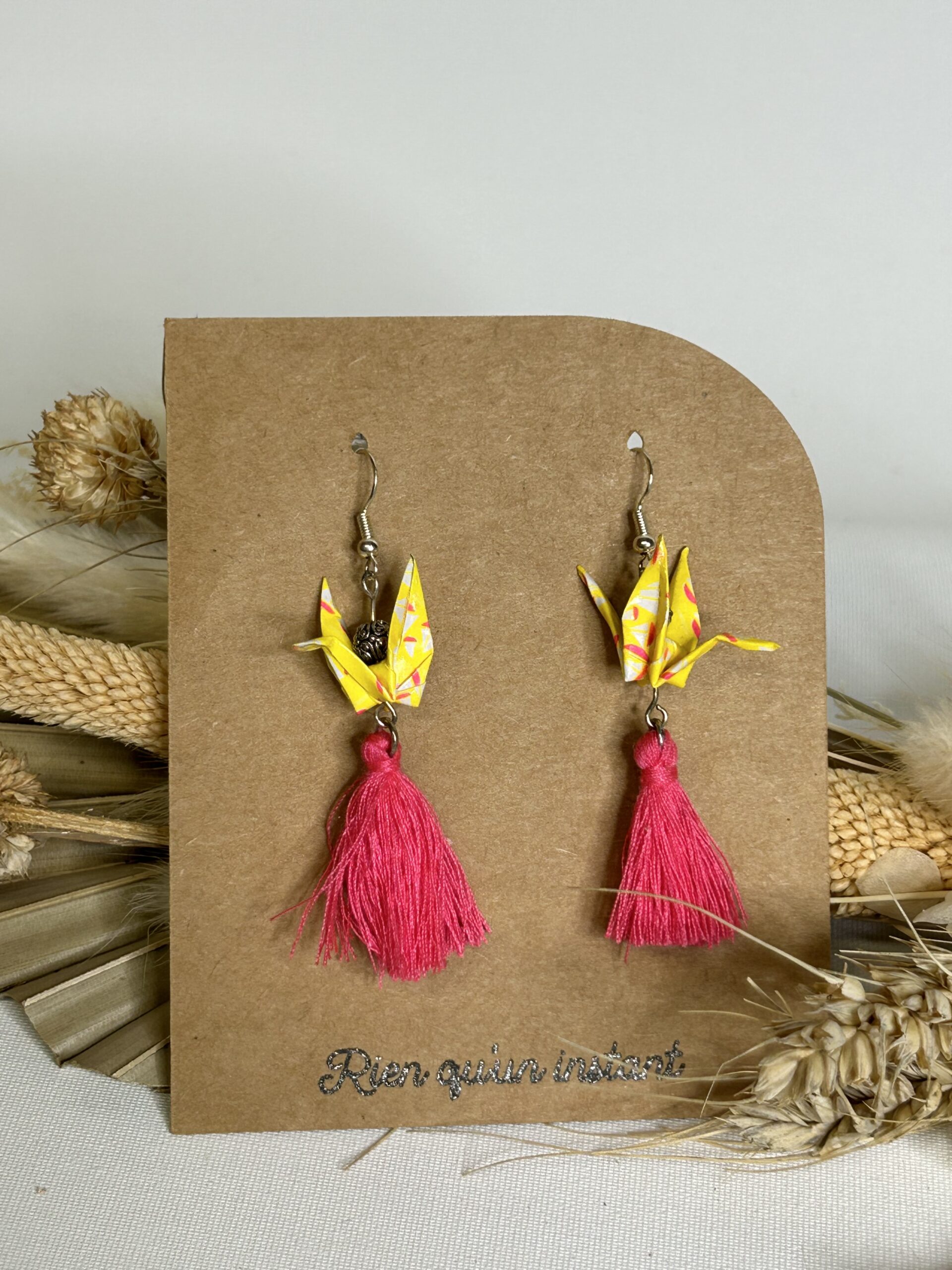 La grue en origami évoque la paix, la chance et la longévité. Ainsi, ce bijou ne se limite pas à un simple accessoire décoratif. Il transmet une intention et une émotion, ce qui le rend idéal pour celles qui aiment porter des pièces porteuses de sens. De plus, le mouvement naturel du pompon apporte de la fluidité et attire subtilement le regard.