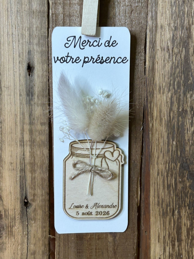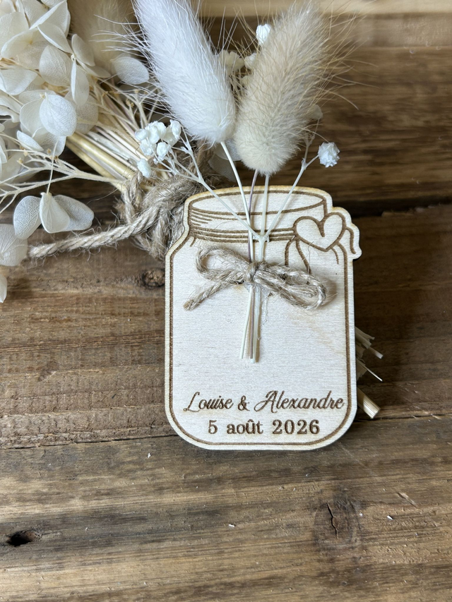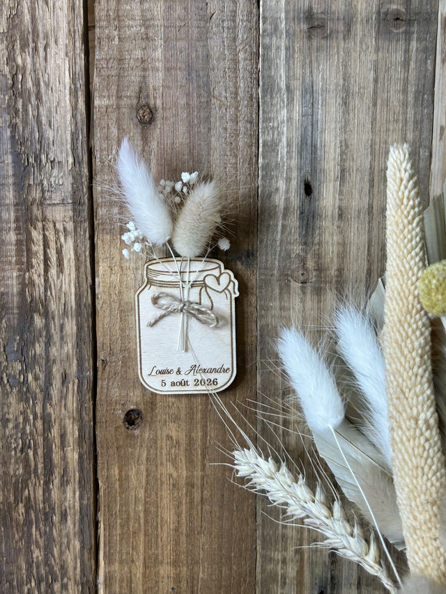Gravé avec les prénoms des mariés et la date du mariage, ce petit bocal en bois au style champêtre est décoré à la main avec un mini bouquet de fleurs séchées et une ficelle en lin naturel. Chaque pièce est unique et réalisée avec soin dans mon atelier.