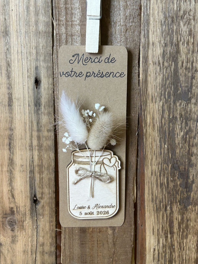 Magnet personnalisé en bois et fleurs séchées support kraft – Cadeau invité mariage