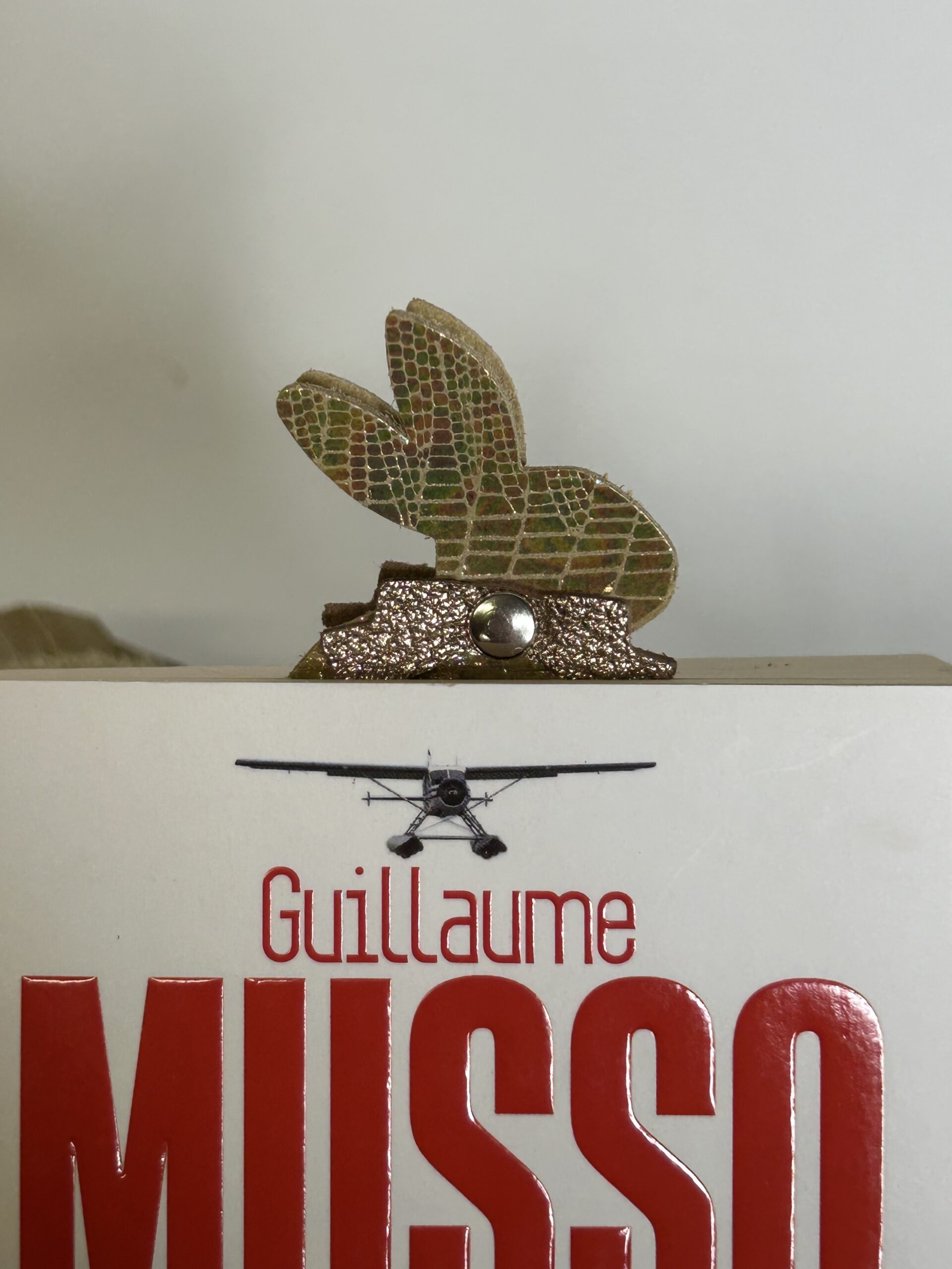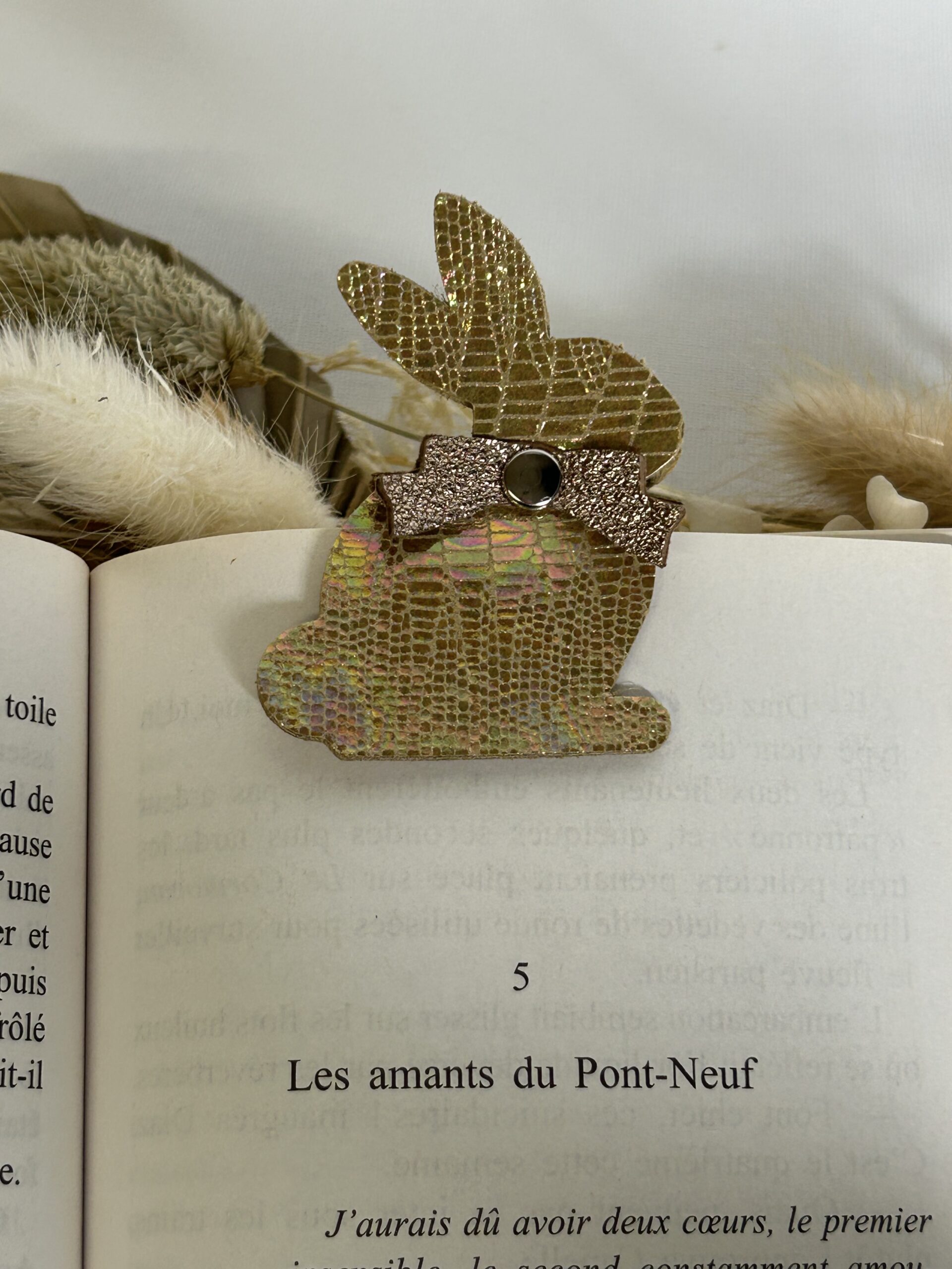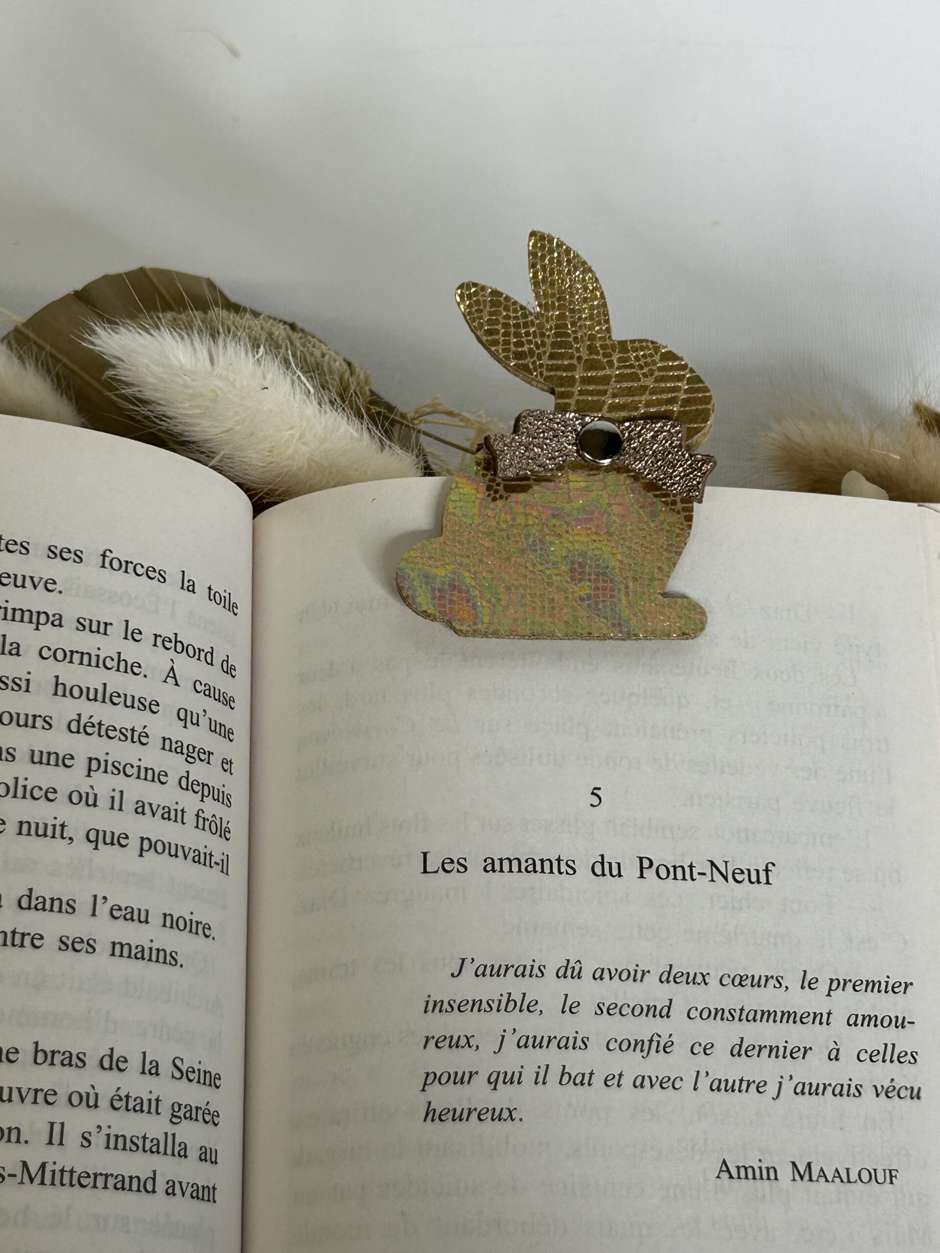 Entièrement fait main, ce marque-page se distingue par son cuir texturé aux reflets dorés et irisés. Son motif lapin apporte une touche poétique et chaleureuse. De plus, chaque pièce possède un caractère unique, ce qui en fait un accessoire authentique et singulier.