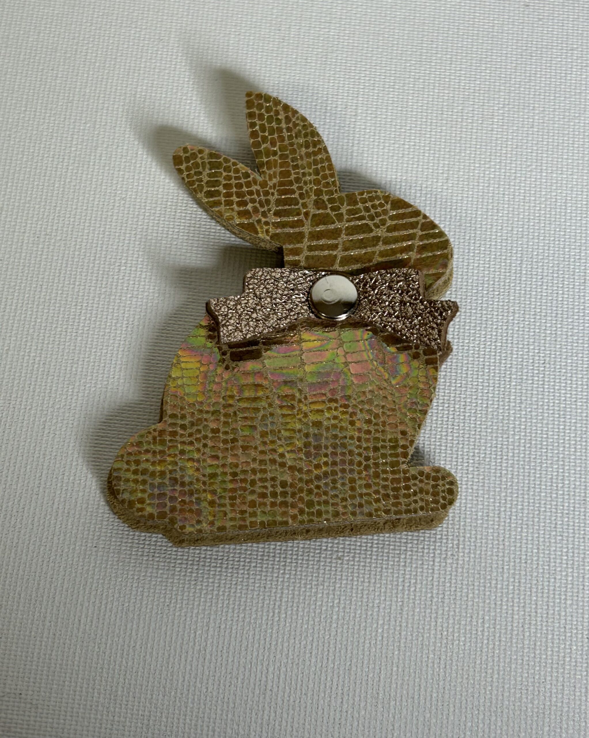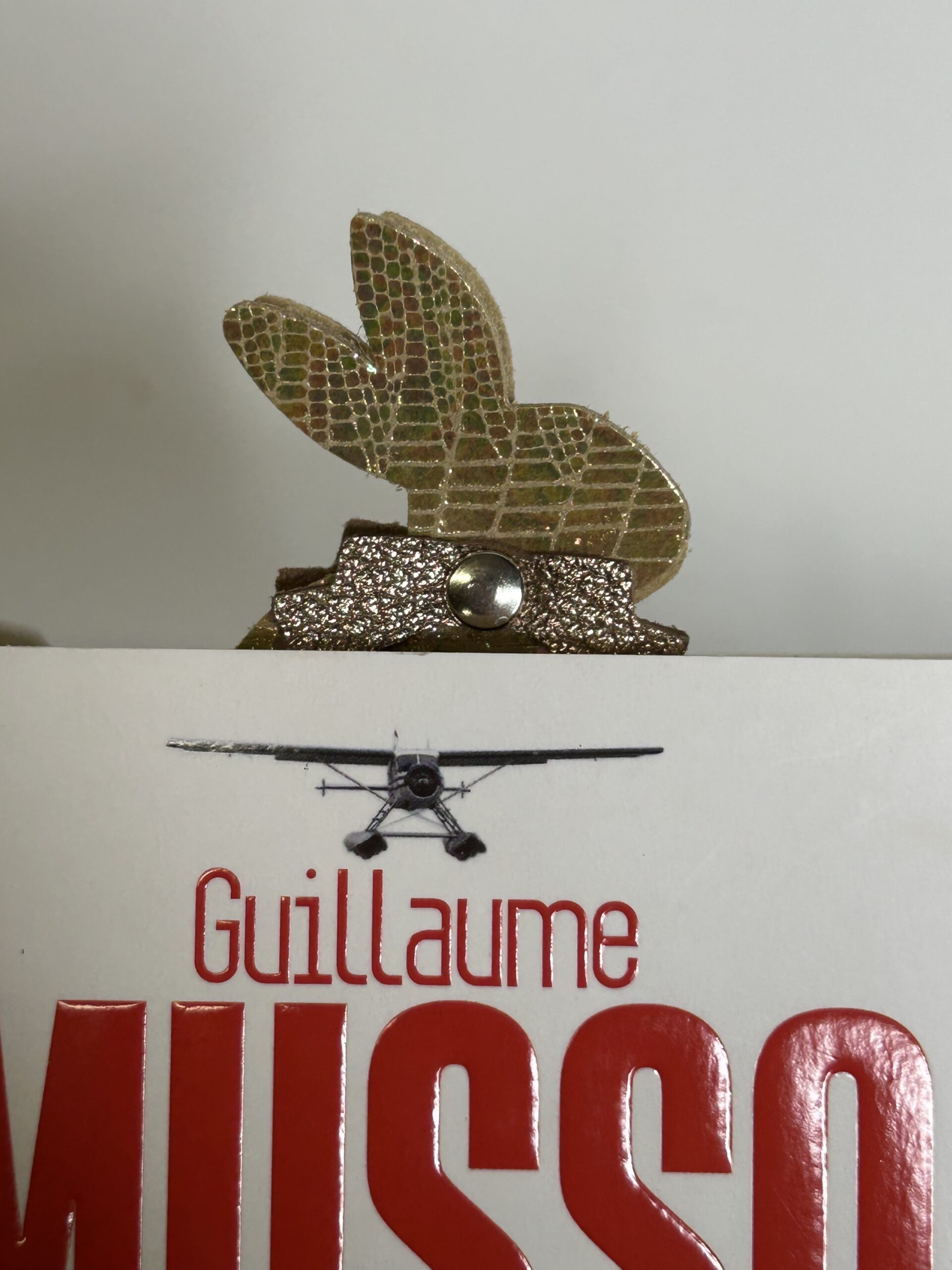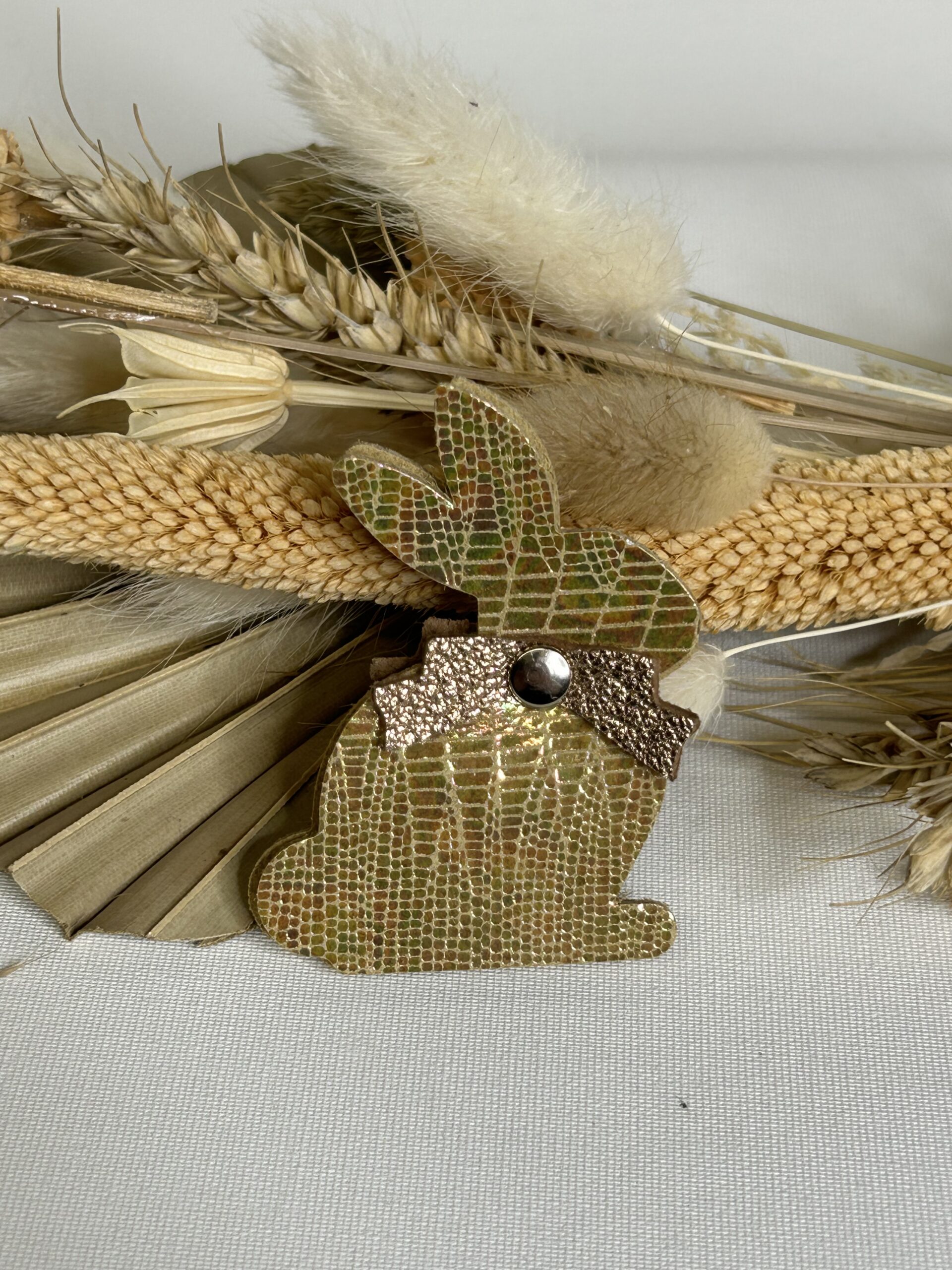 Entièrement fait main, ce marque-page se distingue par son cuir texturé aux reflets dorés et irisés. Son motif lapin apporte une touche poétique et chaleureuse. De plus, chaque pièce possède un caractère unique, ce qui en fait un accessoire authentique et singulier.