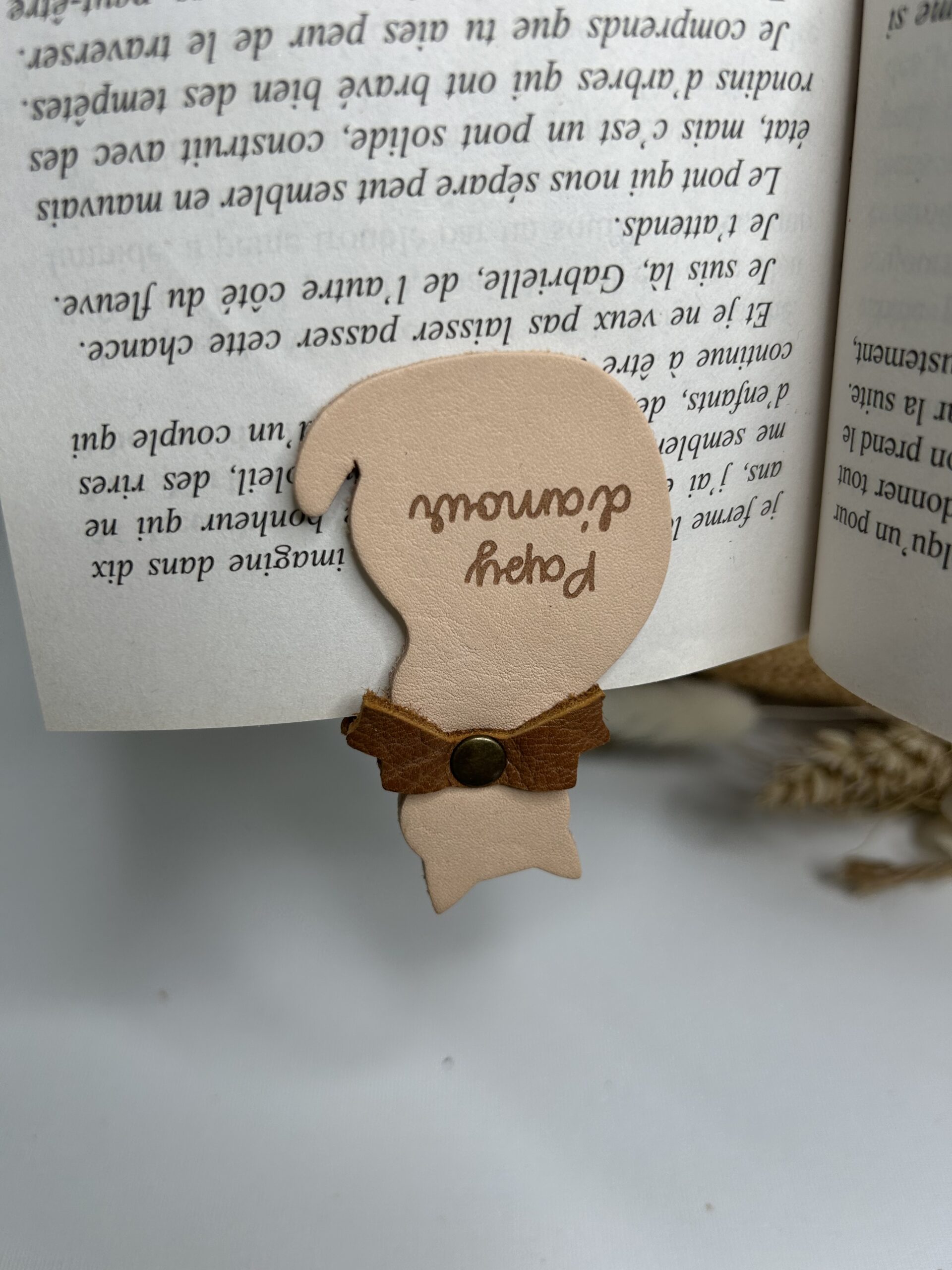 Marque-page magnétique en cuir gravé. Élégant, pratique et chargé d’émotion, il maintient les pages sans les abîmer.