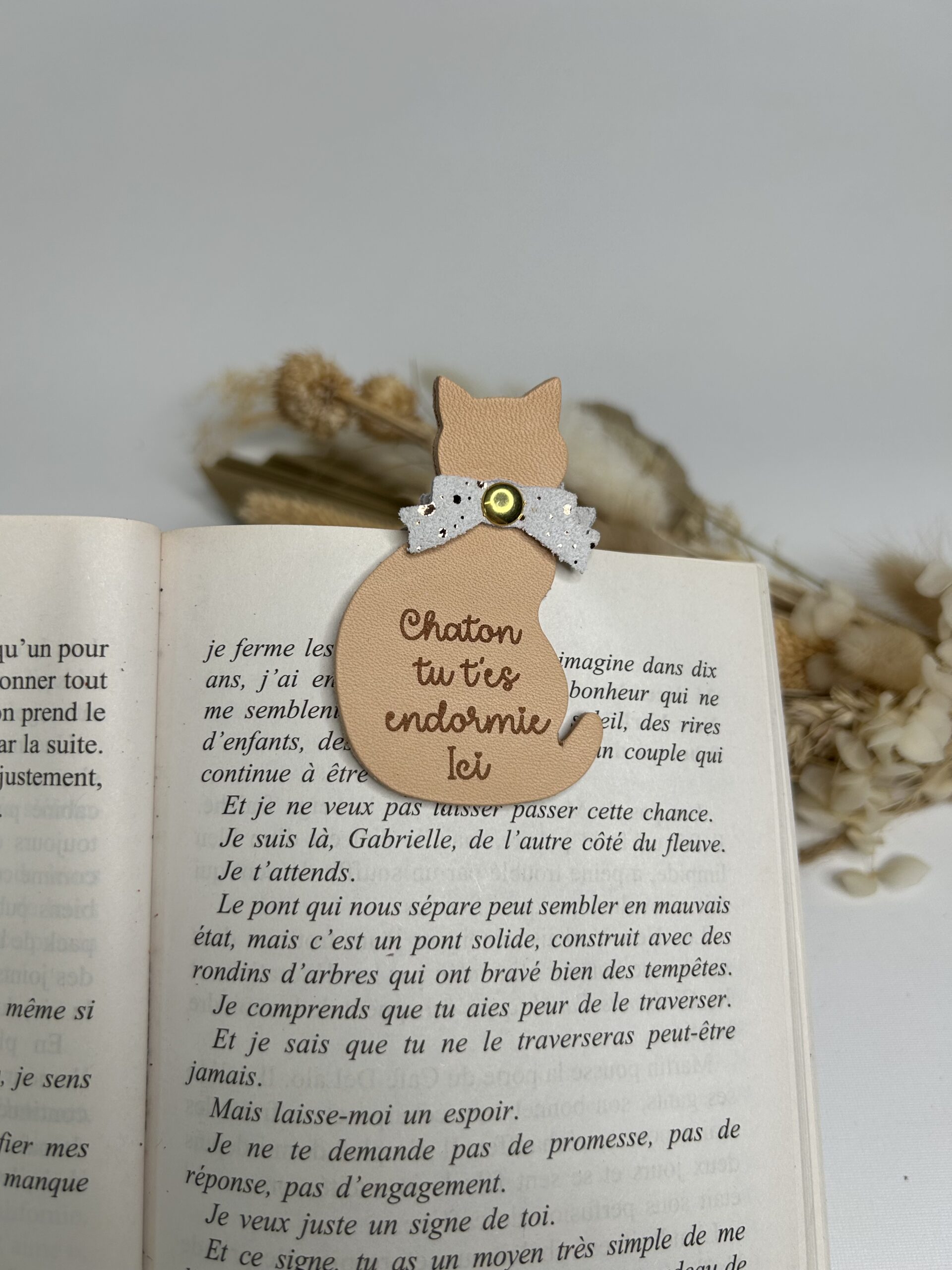 Conçu en cuir de qualité, il se distingue par sa forme délicate et son inscription gravée. Ainsi, chaque détail apporte une touche raffinée à vos moments de lecture. De plus, son système magnétique maintient parfaitement les pages sans les abîmer.