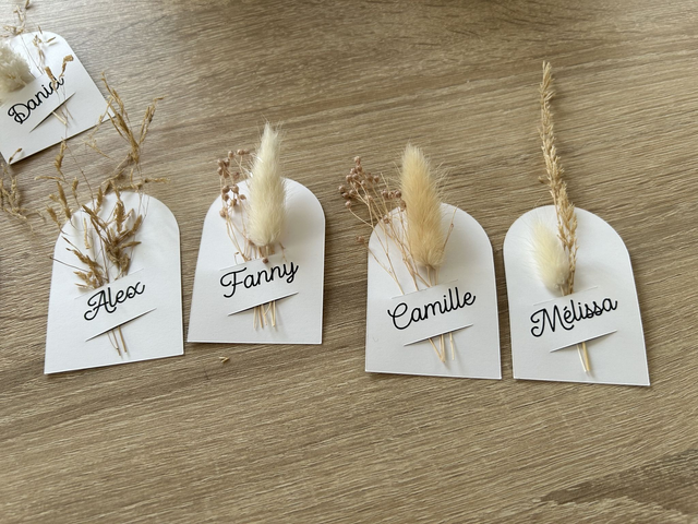 Idéals pour sublimer vos tables de mariage, baptême, anniversaire ou tout autre événement festif, ces marques-places ajoutent une note bohème et champêtre à votre décoration. Vos invités seront ravis de découvrir ce petit détail personnalisé qui rendra votre réception inoubliable.