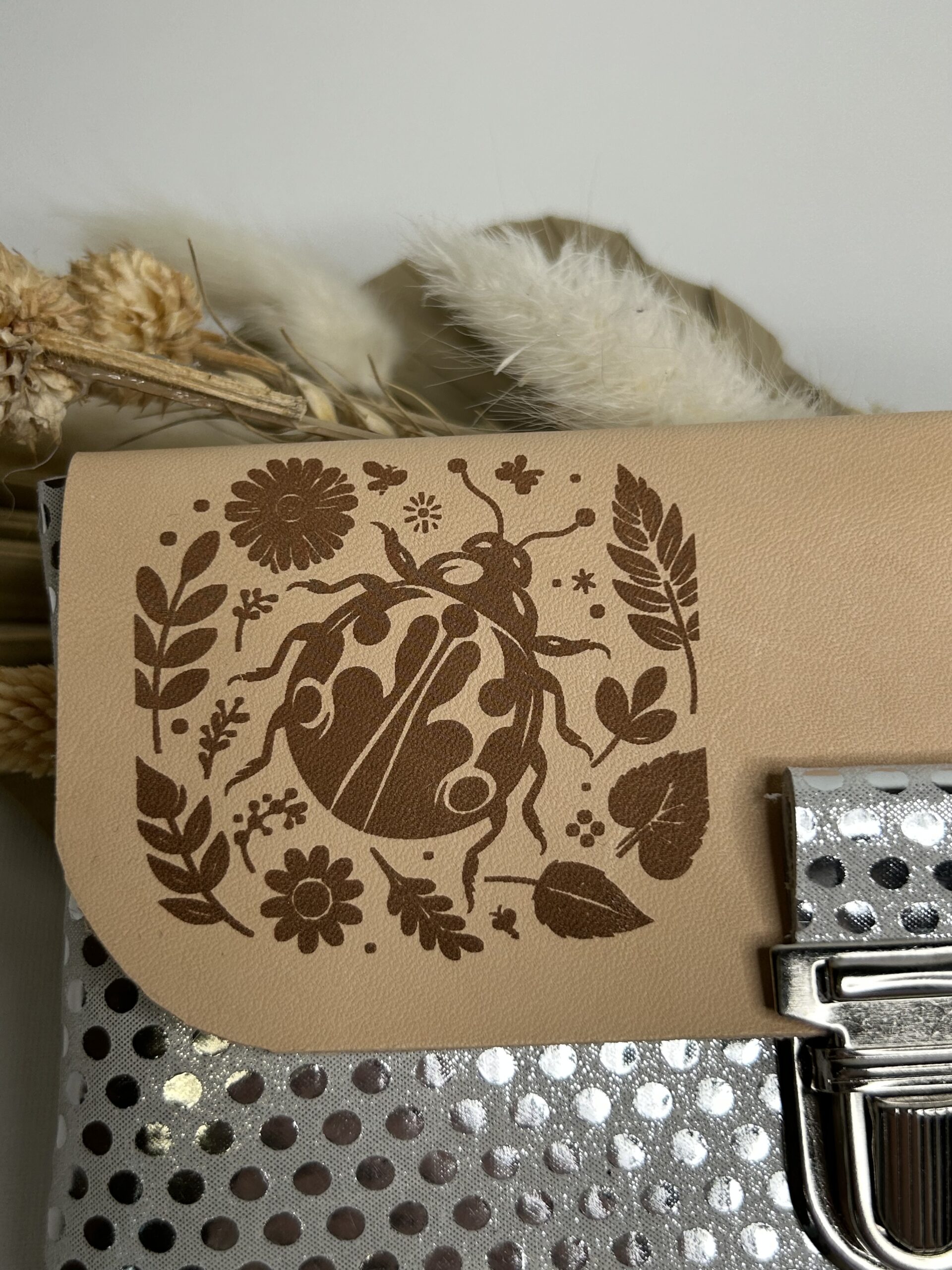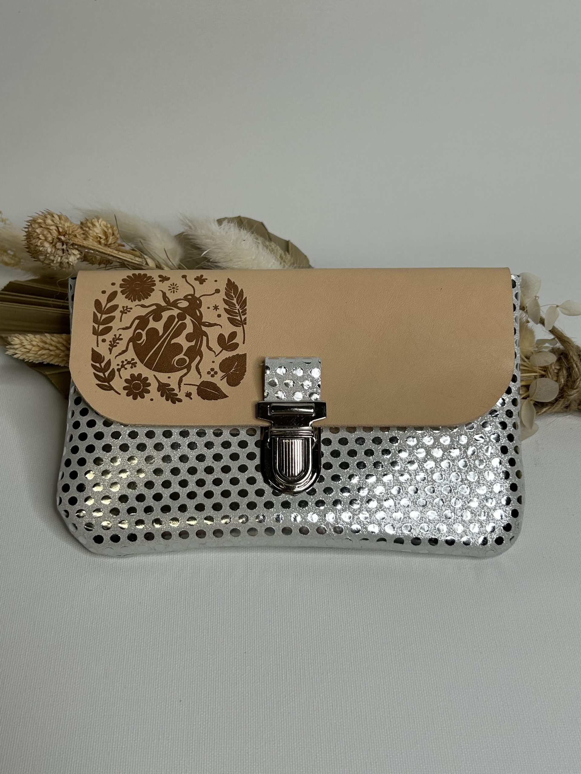 Pochette à papiers en cuir argenté avec son rabat délicatement gravé