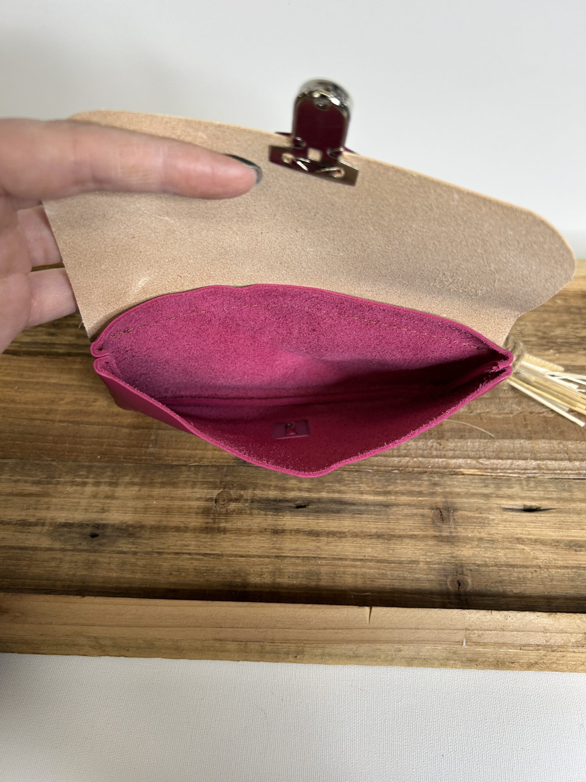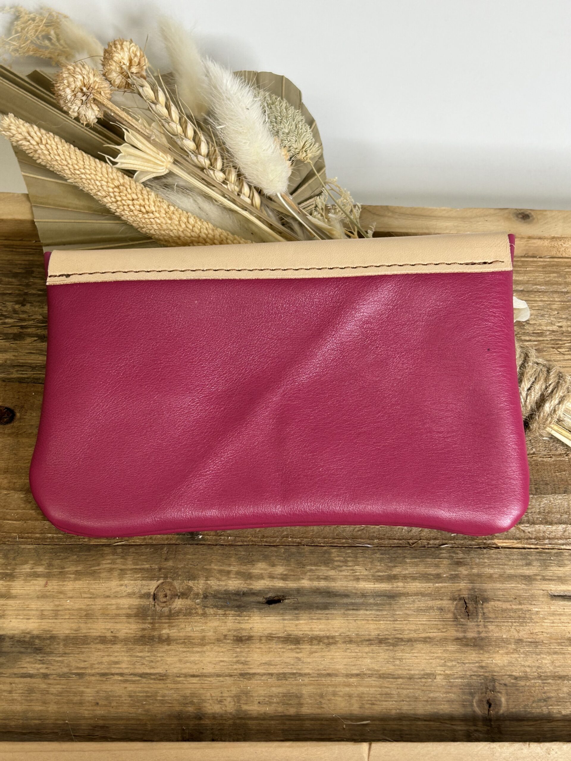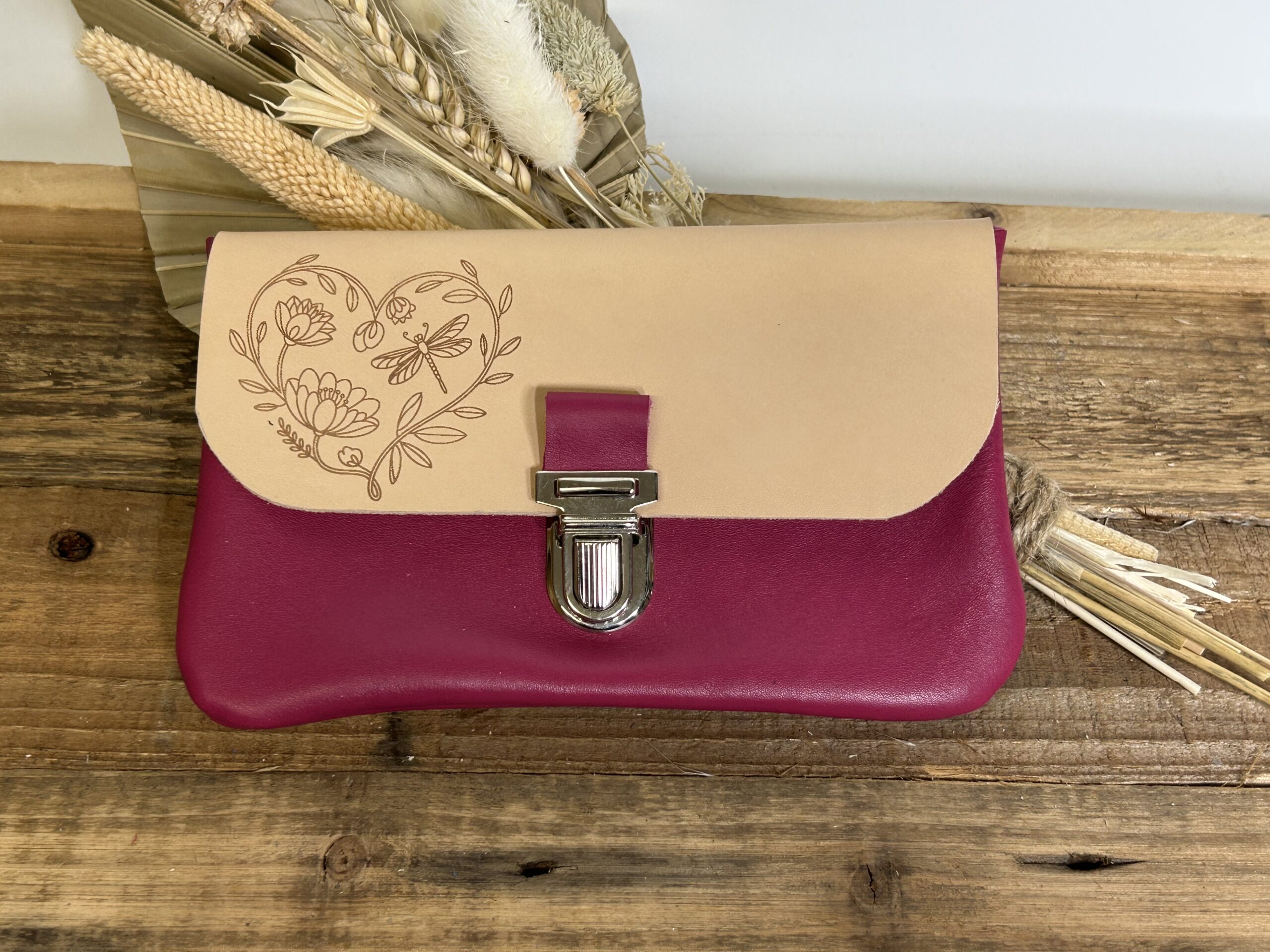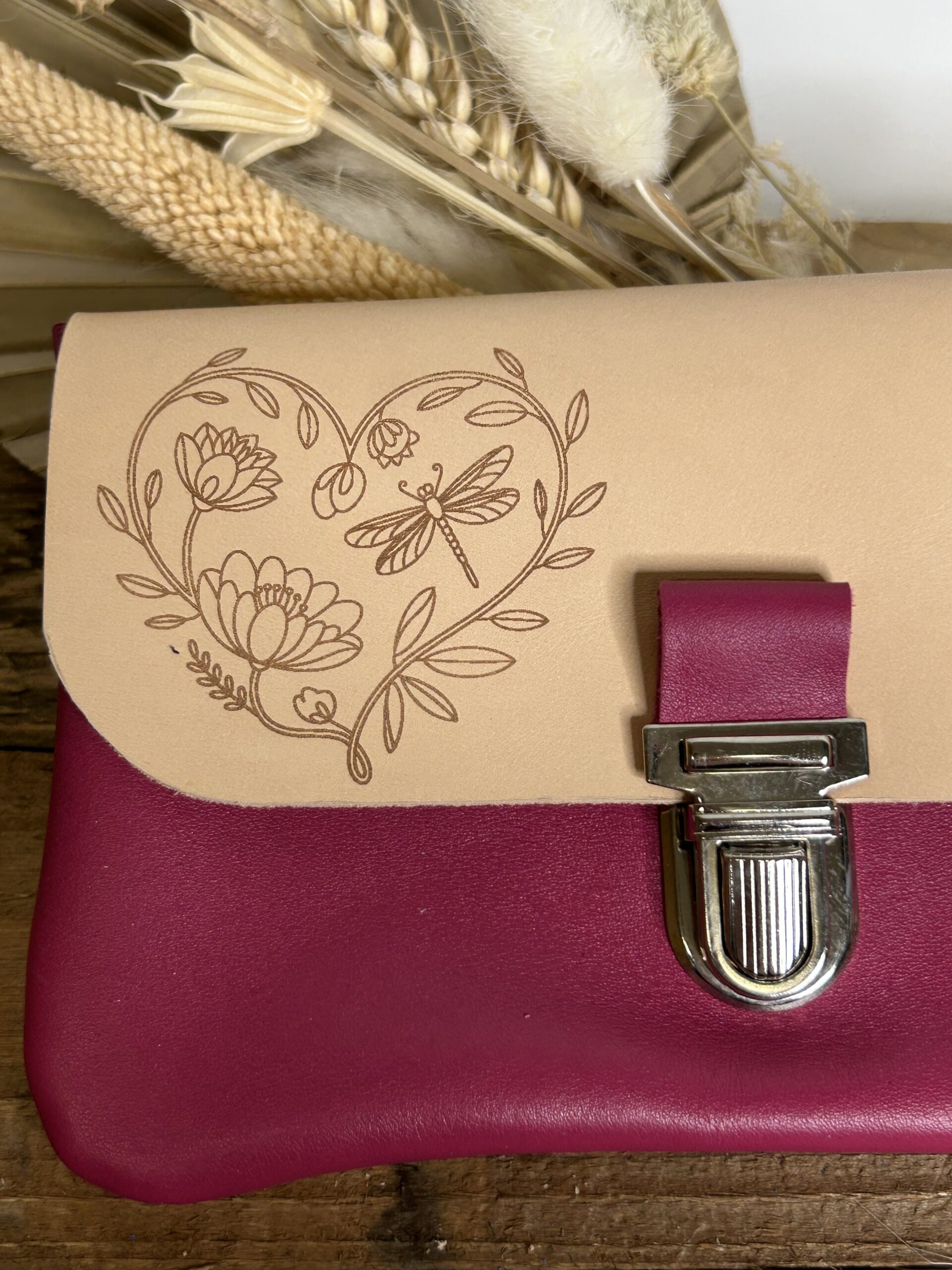 Pochette à papiers en cuir rose avec son rabat délicatement gravé