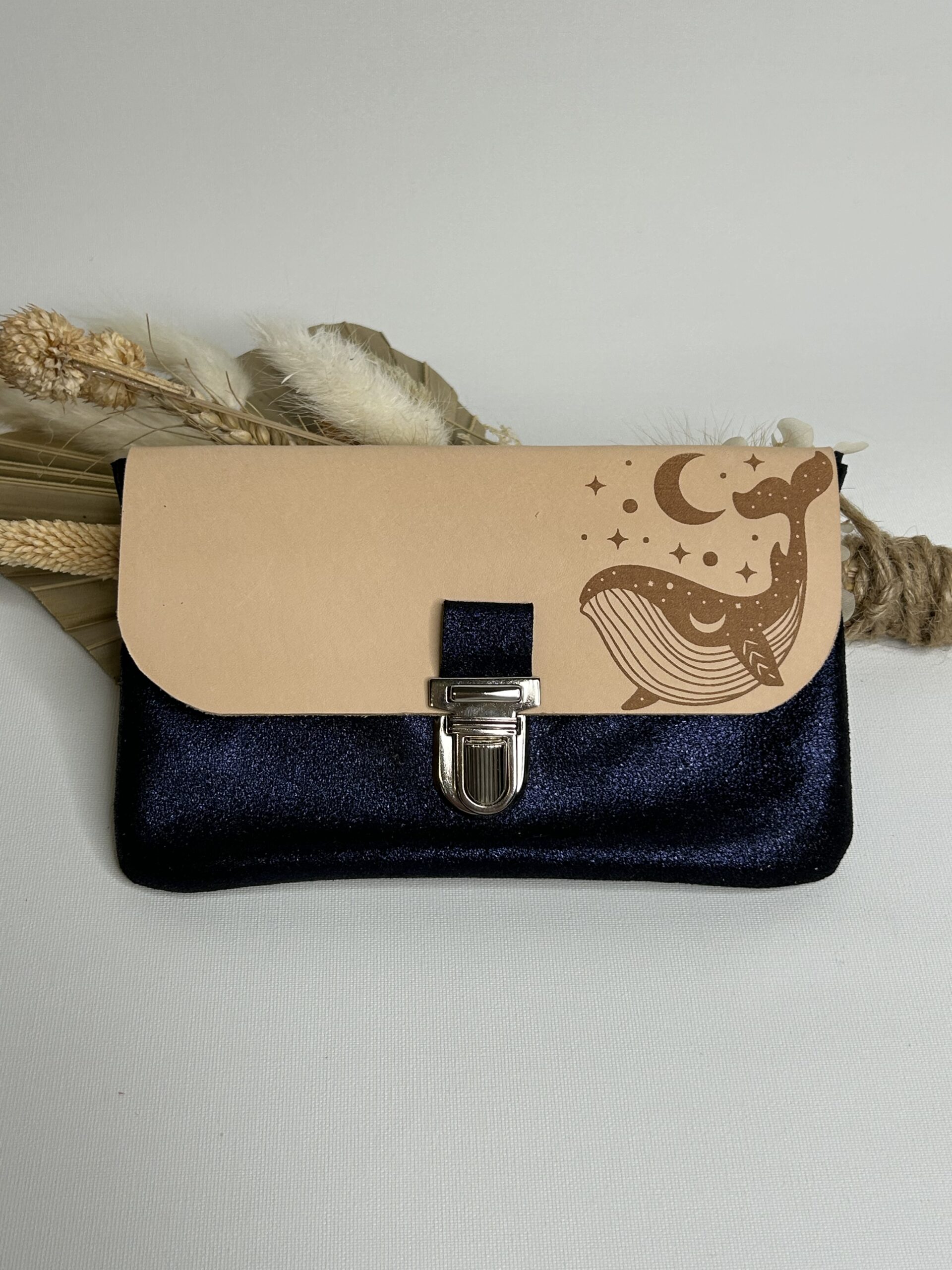 Pochette à papiers en cuir bleu marine pailleté avec son rabat délicatement gravé