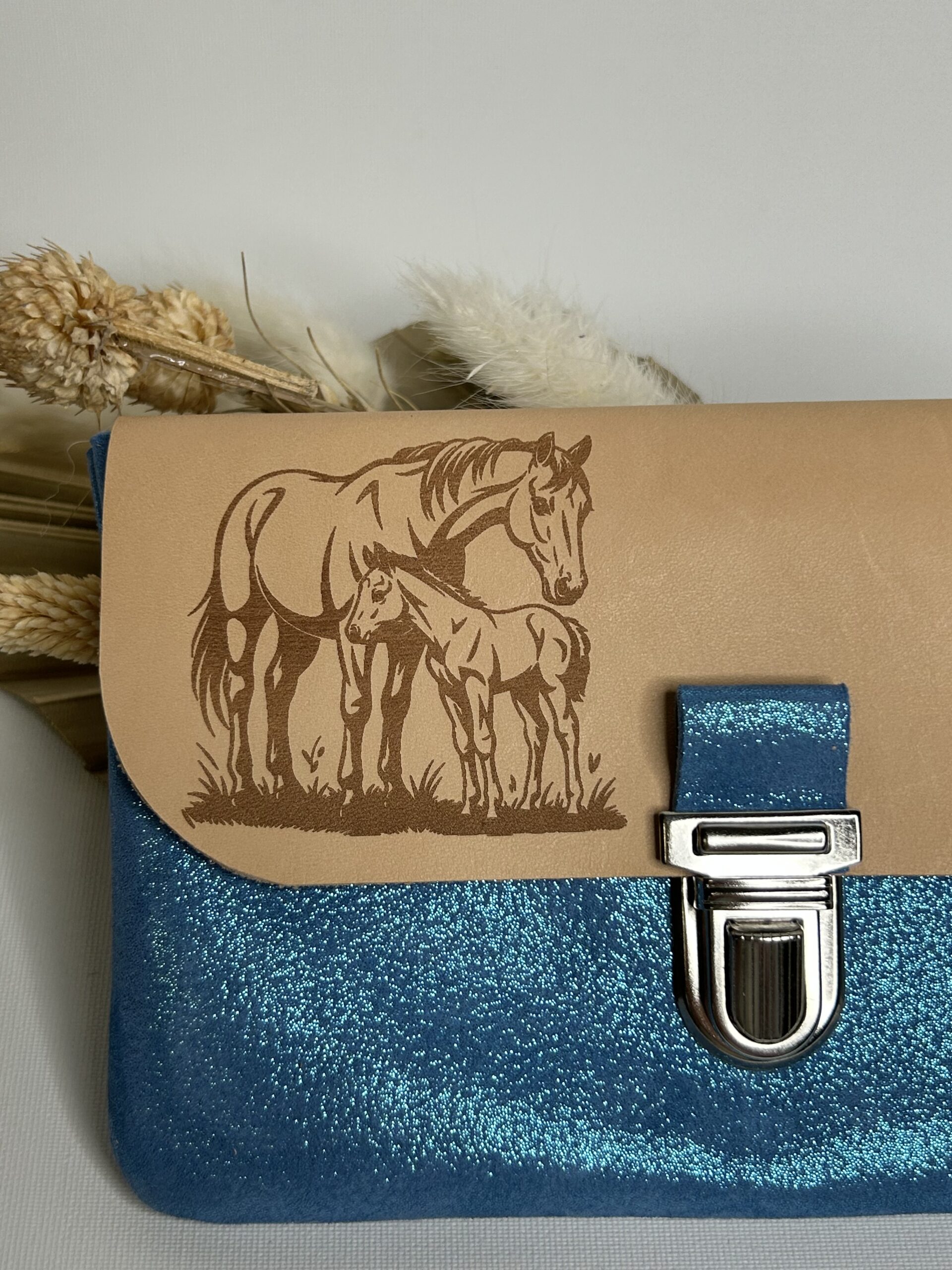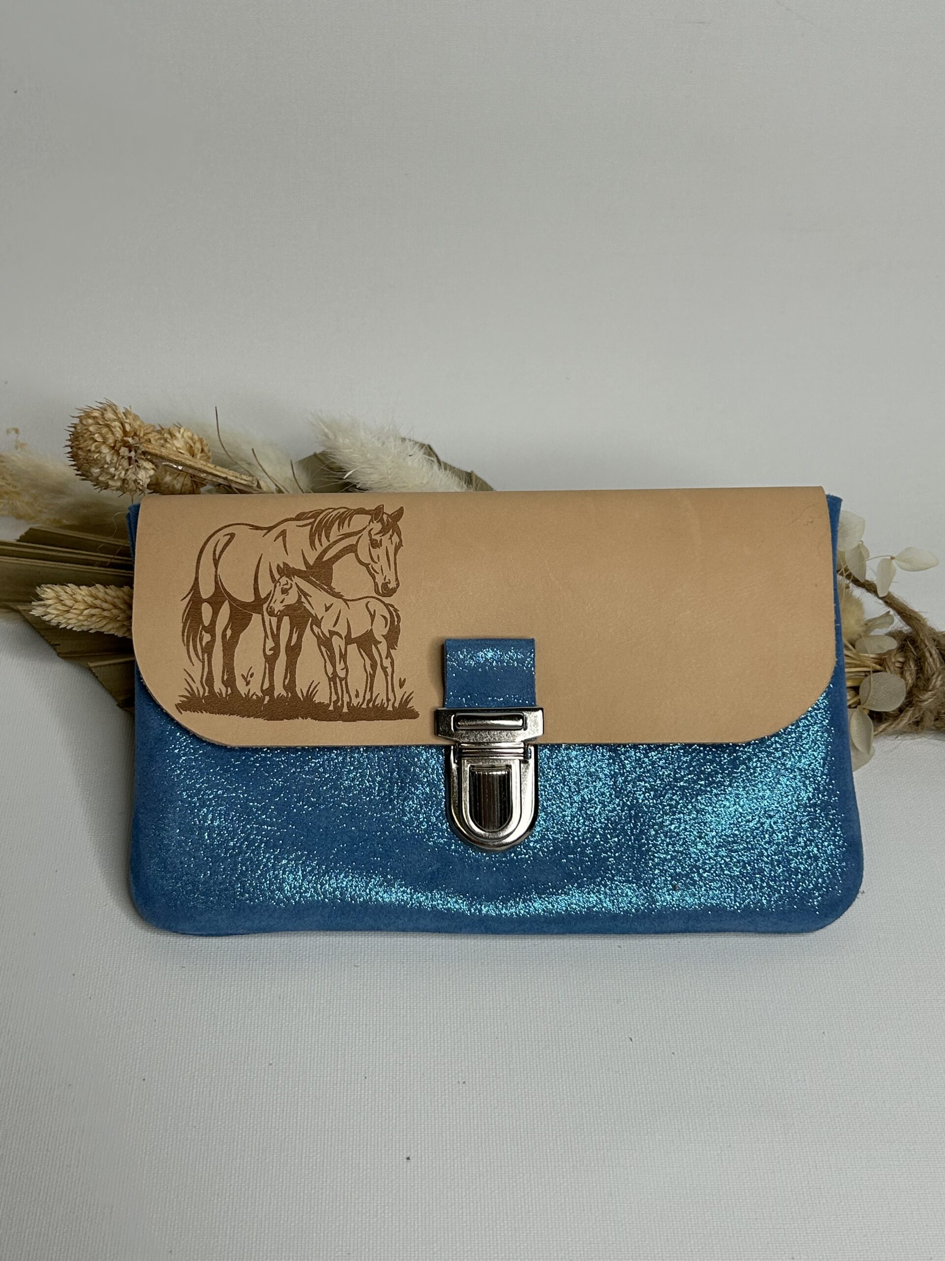 Pochette à papiers en cuir bleu turquoise pailleté avec son rabat délicatement gravé