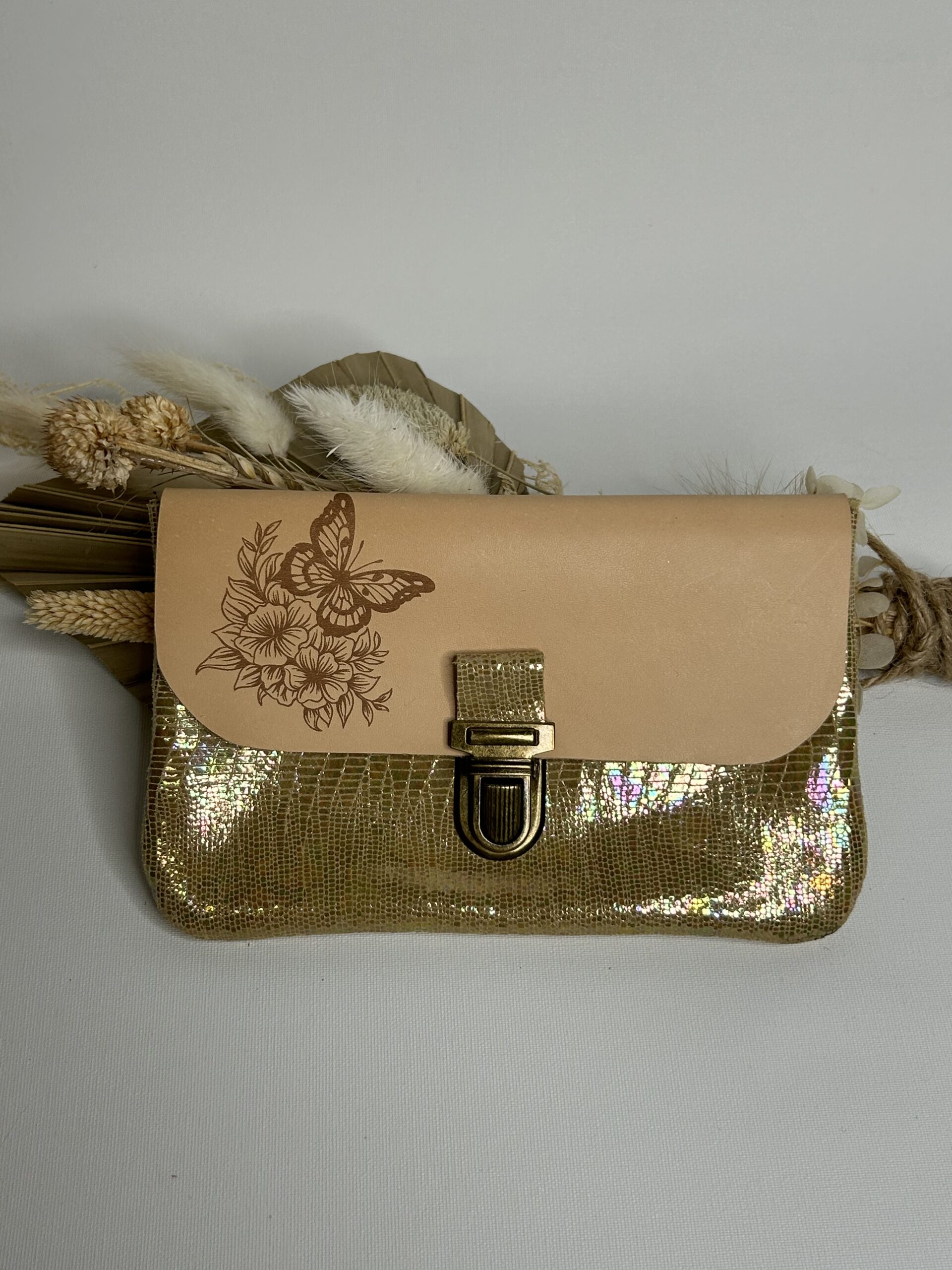Pochette à papiers en cuir doré irisé avec son rabat délicatement gravé