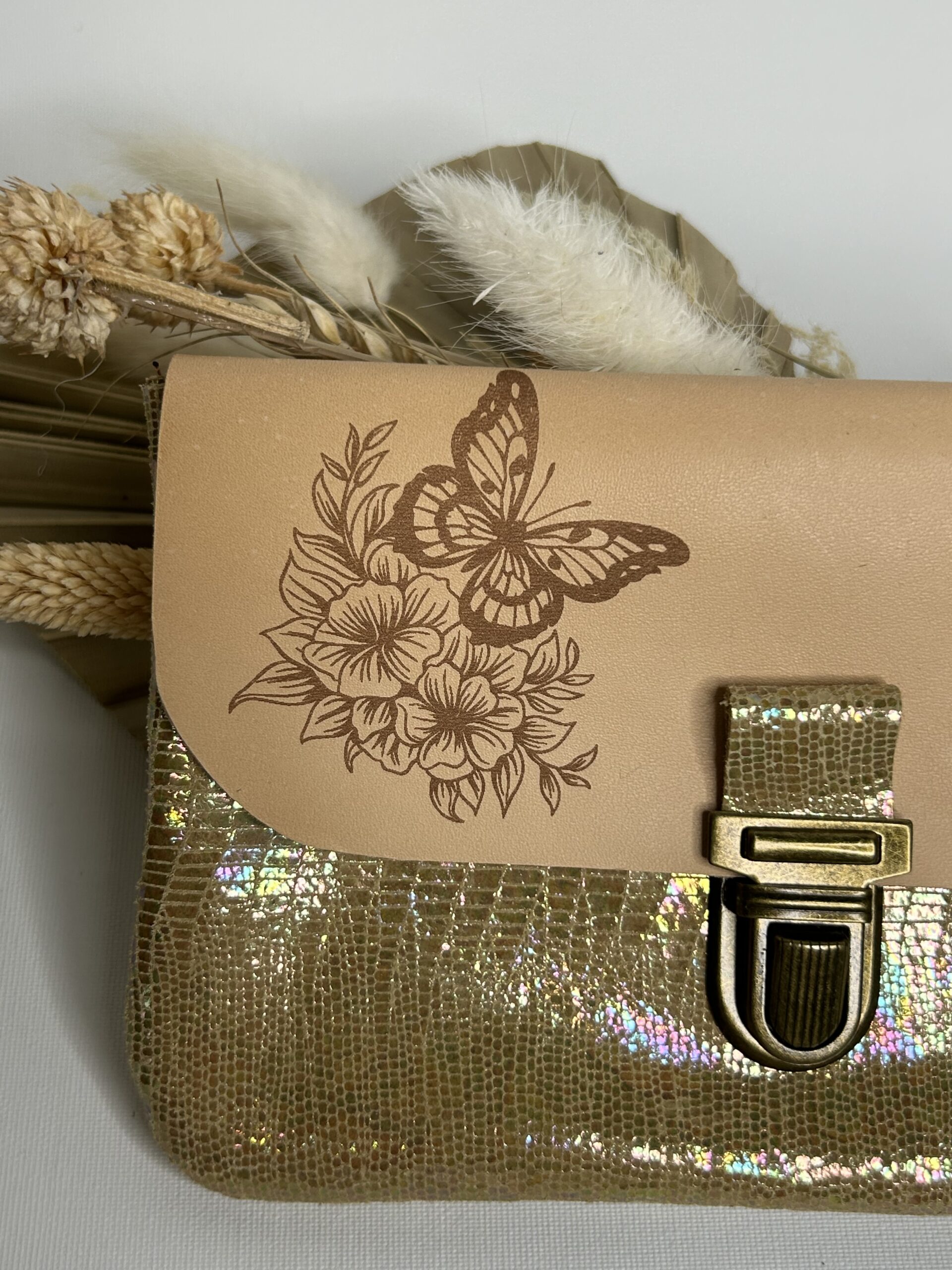 Pochette à papiers en cuir gravure papillon et fleurs