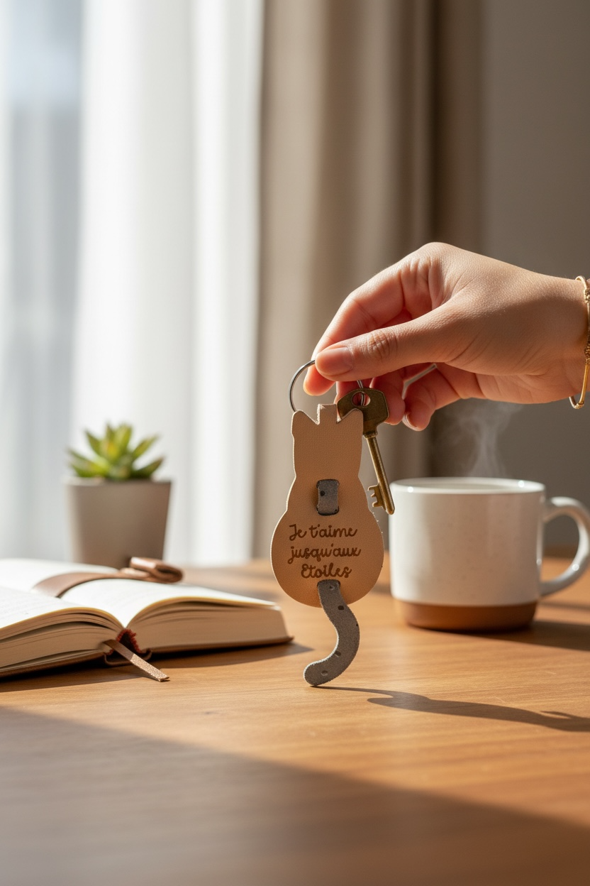 Porte-clés chat personnalisé en cuir fait main. Pratique, durable et chargé d’émotion, il accompagne les clés au quotidien avec style et sens.