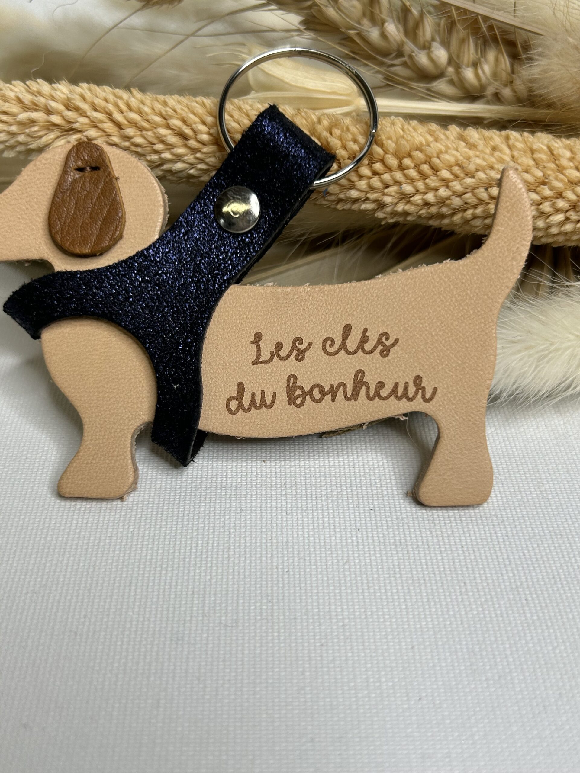 Porte clé Chien en cuir gravé “Les clés du bonheur”