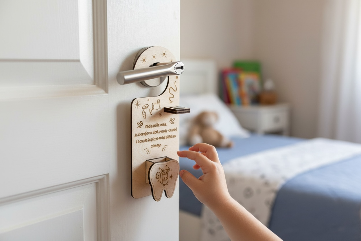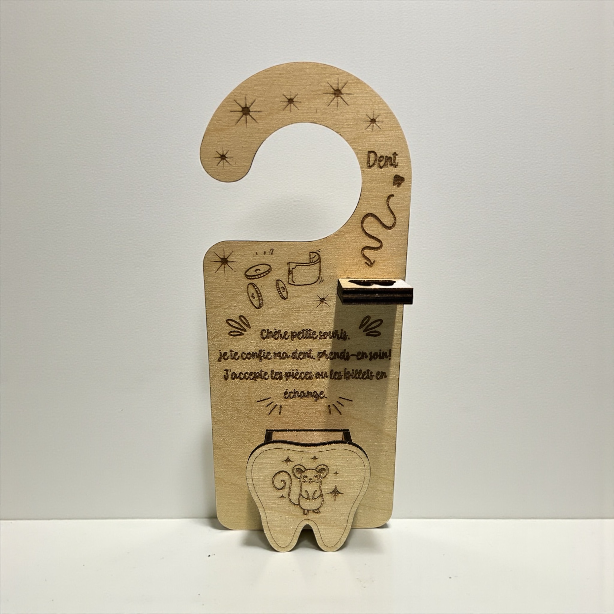 Fabriqué en bois naturel, cet accroche-porte séduit par son design original et chaleureux. Ses gravures délicates représentent des étoiles, des pièces et une adorable petite souris. Ainsi, chaque détail stimule l’imaginaire et renforce la magie du rituel. De plus, le message gravé invite l’enfant à confier sa dent en toute confiance.