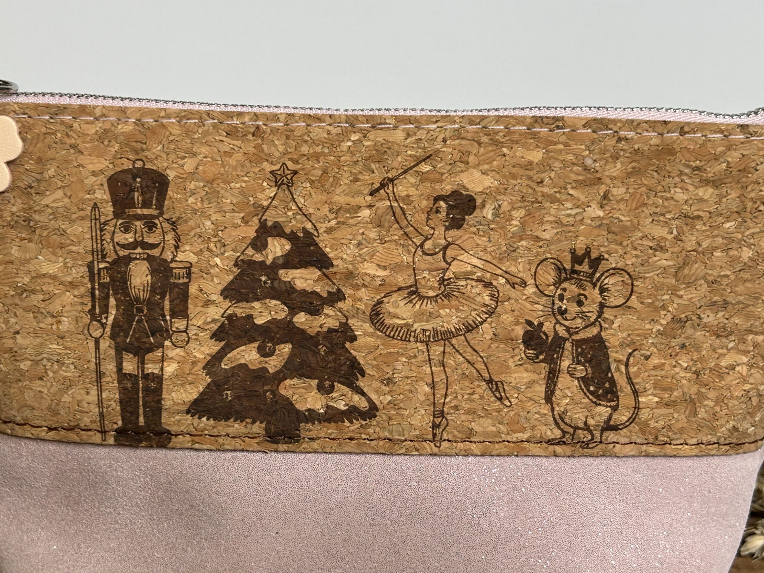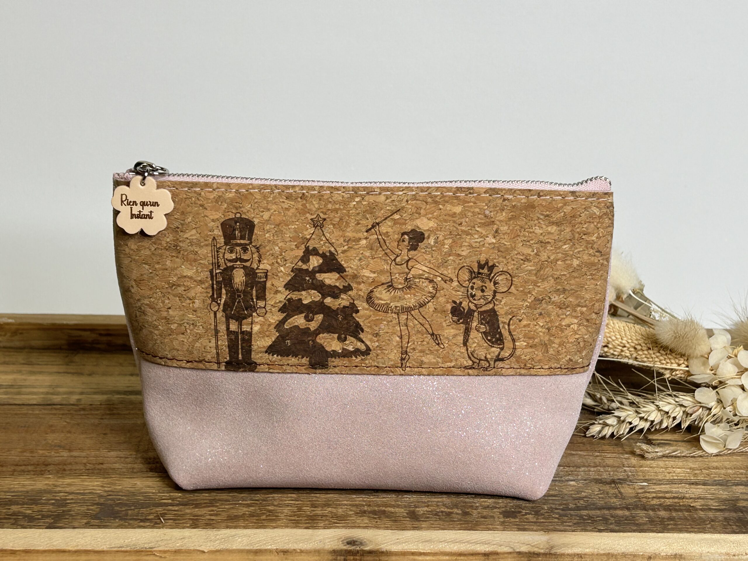 Trousse à maquillage en cuir de vachette véritable rose pale à paillettes et liège naturel gravé