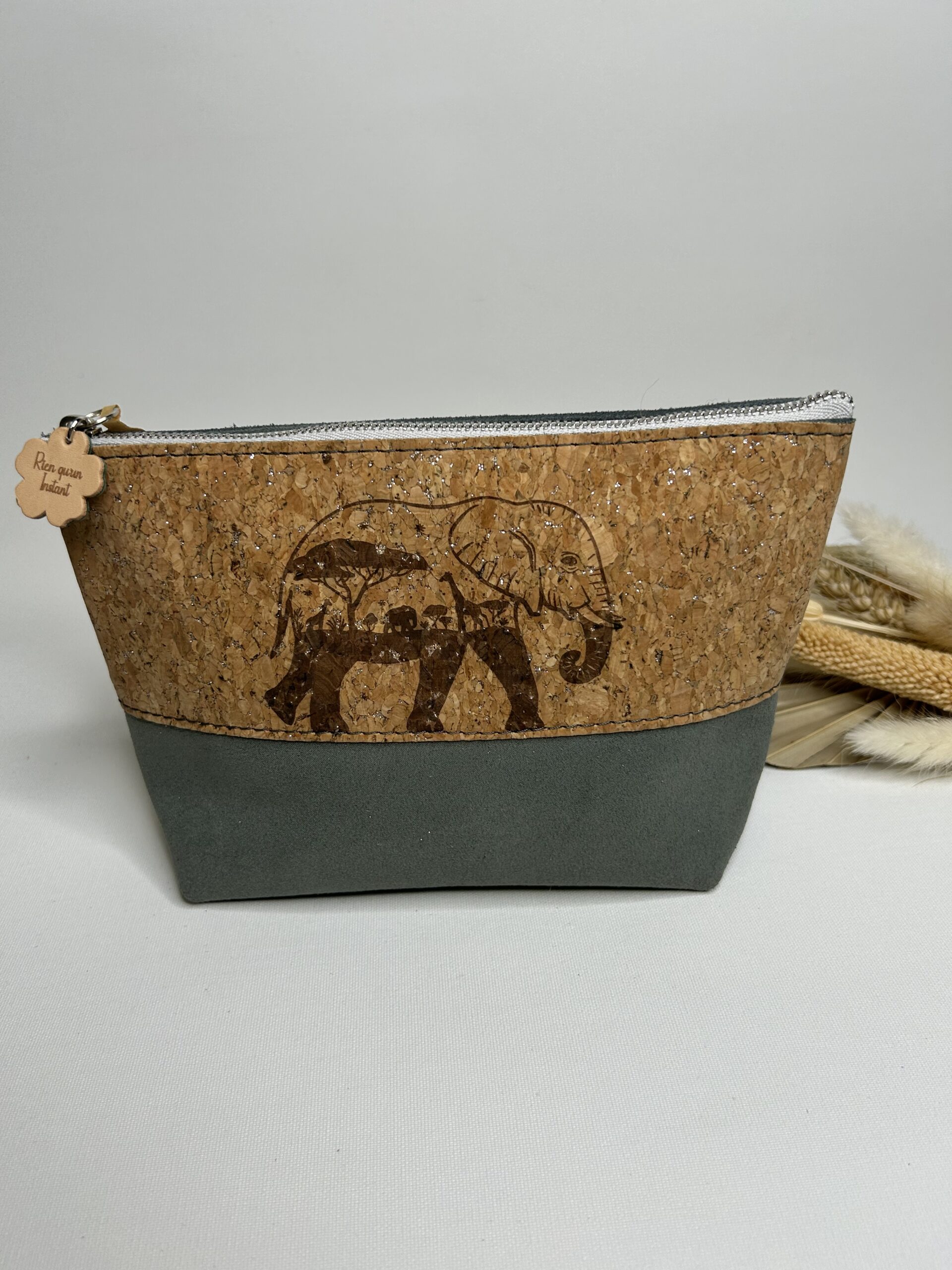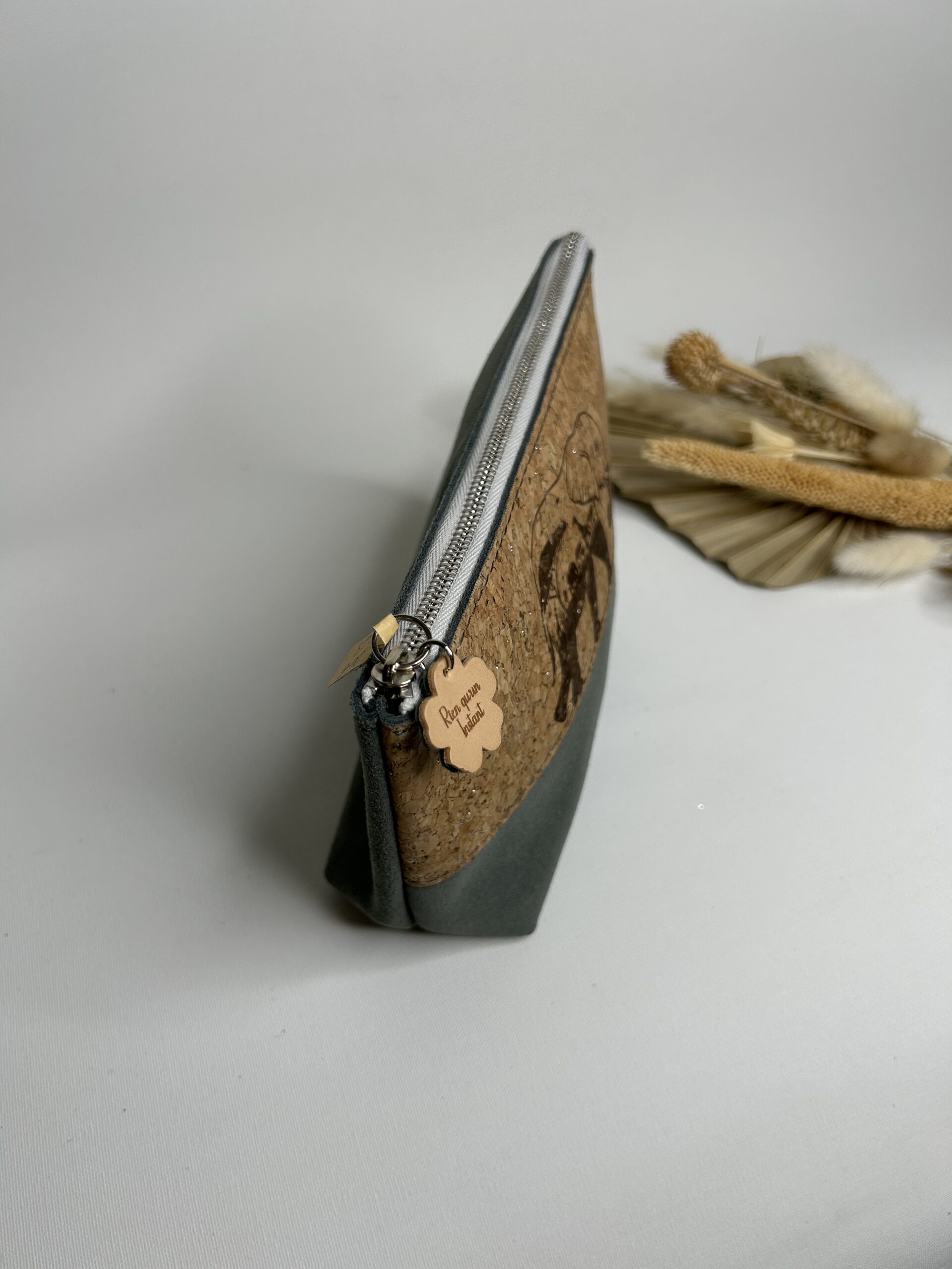 Trousse à maquillage en cuir de vachette véritable gris pailleté et liège naturel gravé