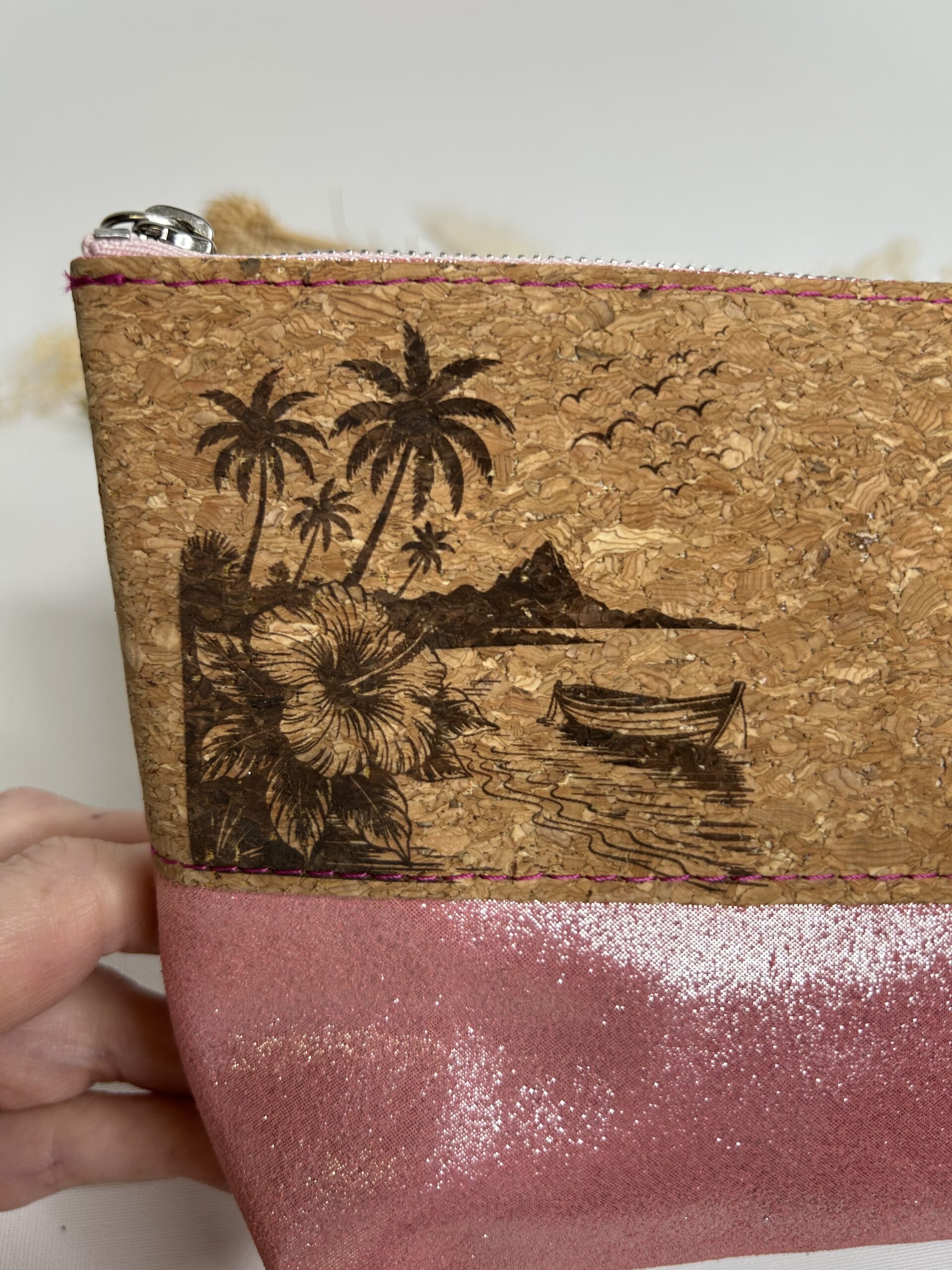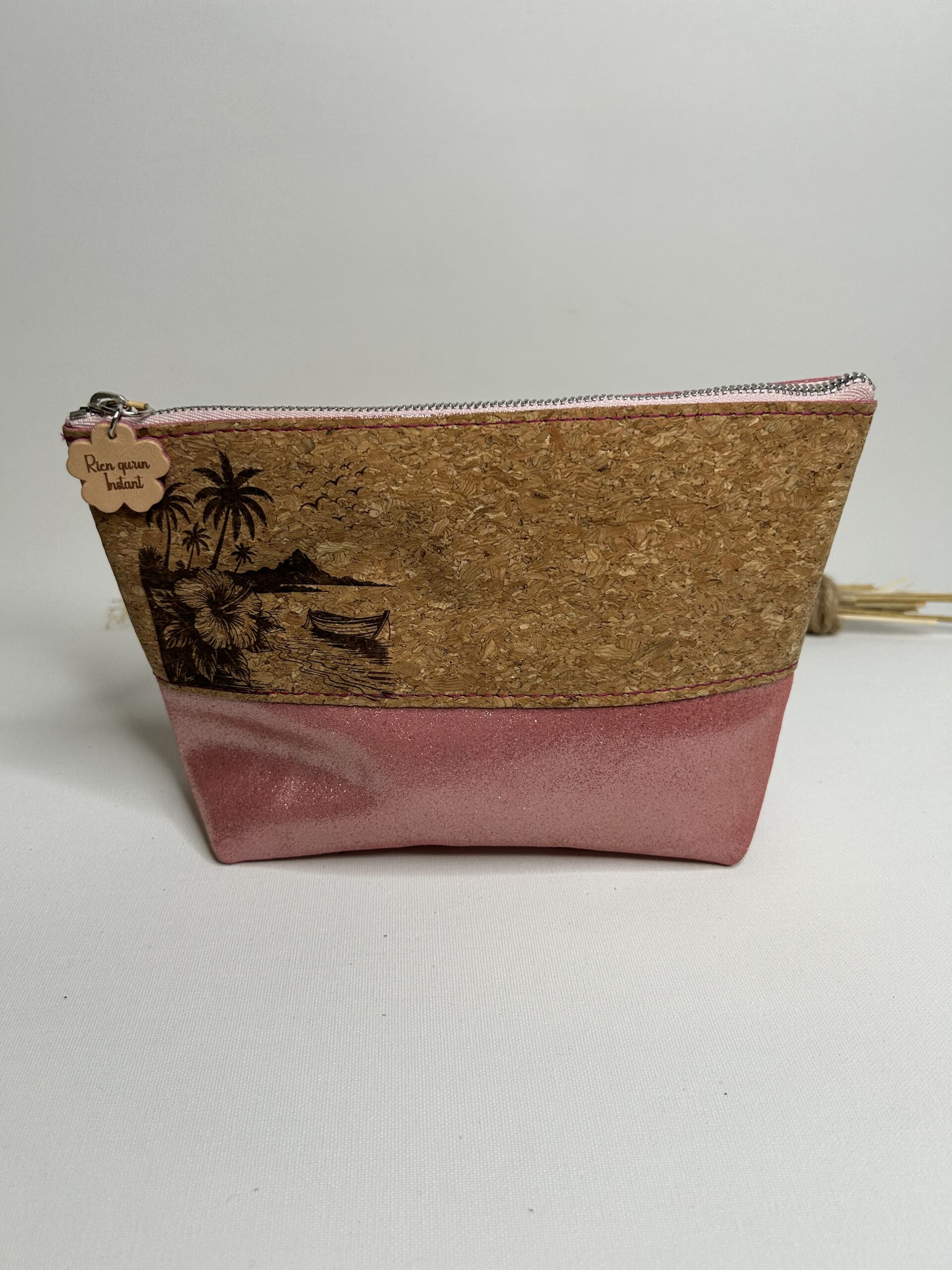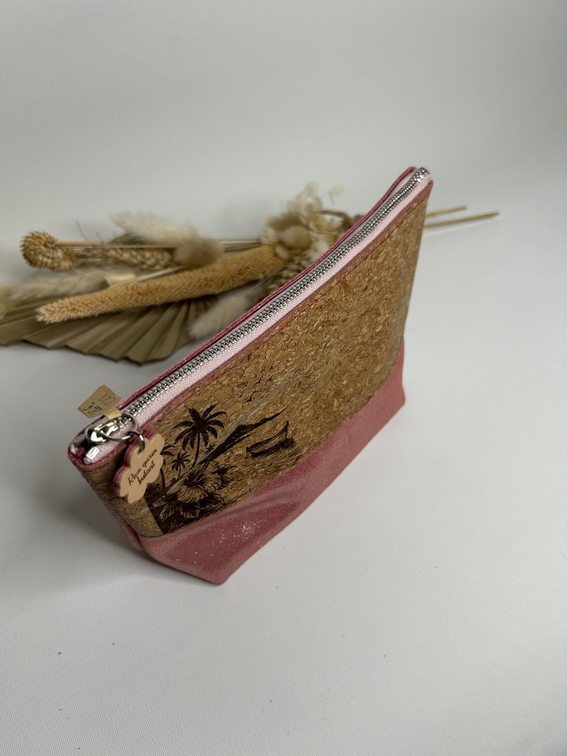 Trousse à maquillage en cuir de vachette véritable rose pailleté et liège naturel gravé